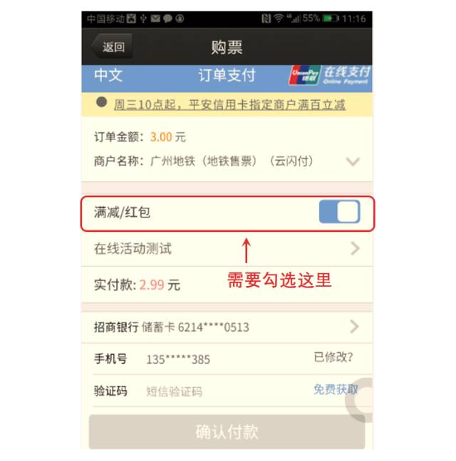 2.用户在支付过程中需明确已勾选了立减选项方可参加活动,如用户没有勾选则视为自动放弃机会,后续不予补发。活动名额有限,用户如勾选了立减选项后显示“此次活动名额已经用完”或没有提示立减后应付金额或提示的立减后应付金额与订单原金额一致等类似情况,即表示优惠名额已发放完毕,请按订单原金额正常交易。