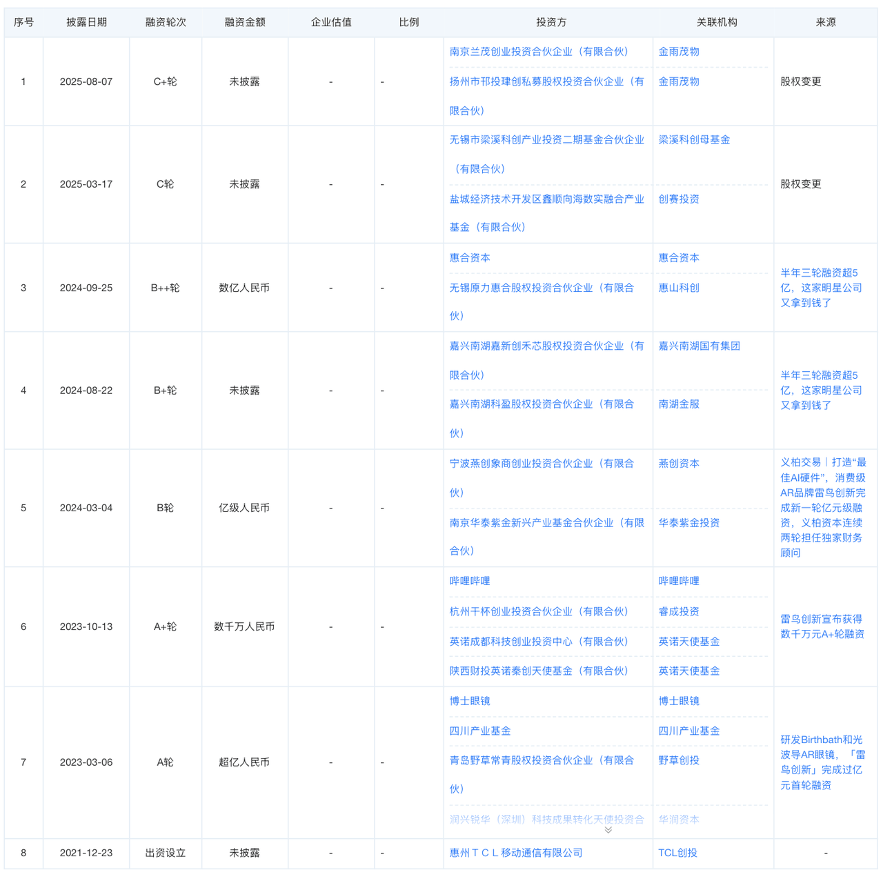 2025 年 11 月 7 日,雷鸟创新宣布完成由中信金石领投、中信证券国际资本及中信证券投资共同参与的 C 轮融资,据称本轮融资创下 2025 年国内 AI+AR 眼镜领域单笔融资金额的最高纪录。